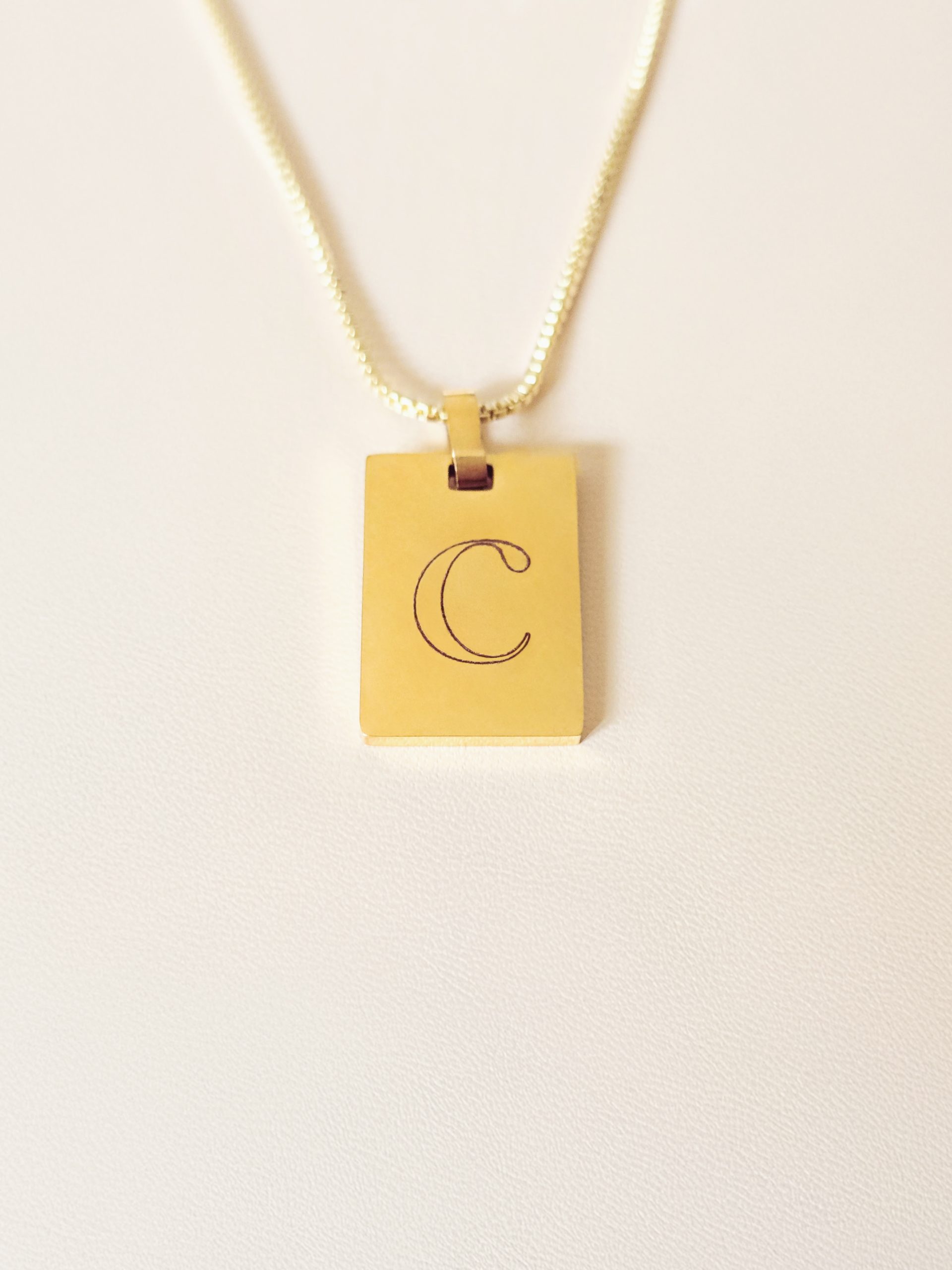 CUSTOMIZED PENDANT: A square gold-plated stainless-steel pendant, expertly engraved to reflect your personal meaning. Customize it with a name, a single letter, or a word that speaks to your journey.
