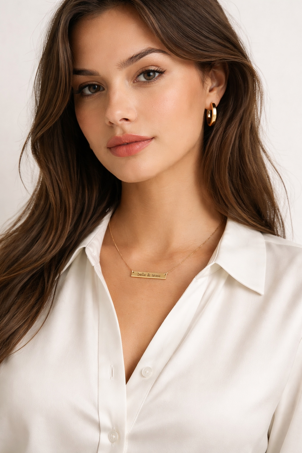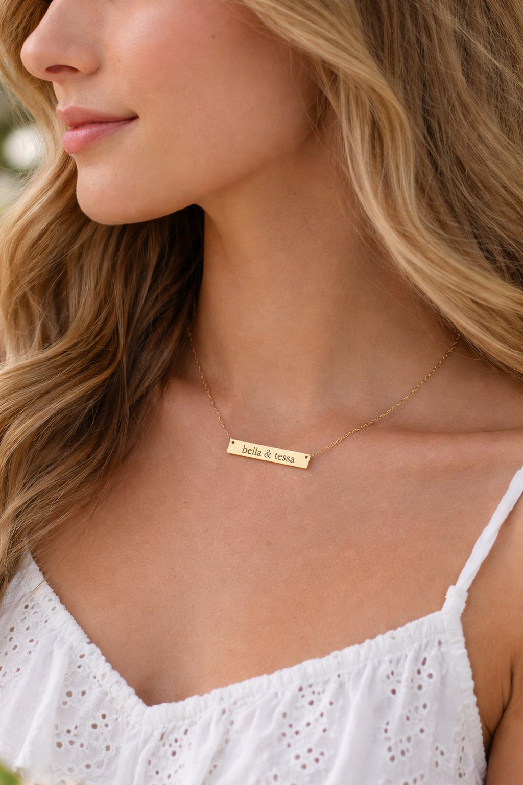 CUSTOMIZED PENDANT: A rectangle gold-plated stainless-steel pendant, expertly engraved to reflect your personal meaning. Customize it with a name, a single letter, or a word that speaks to your journey.